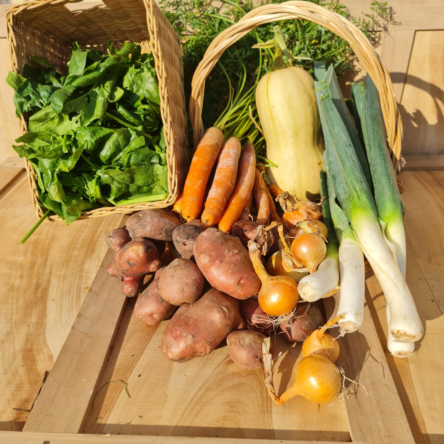 Nos paniers pèsent entre 6 et 8 kg et rassemblent un mélange de légumes de saison, cueillis à la main sur notre ferme des Jardins du Clos à La Chapelle Lasson (Marne) France.