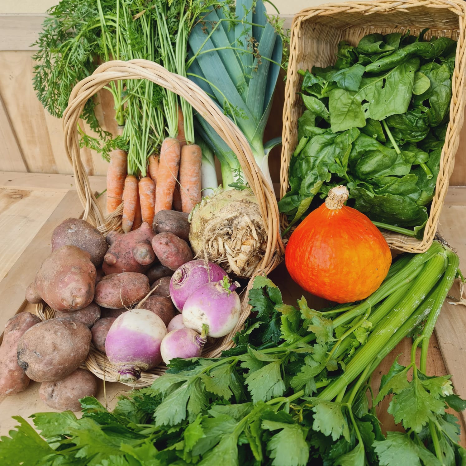 Nos paniers pèsent entre 6 et 8 kg et rassemblent un mélange de légumes de saison, cueillis à la main sur notre ferme des Jardins du Clos à La Chapelle Lasson (Marne) France.